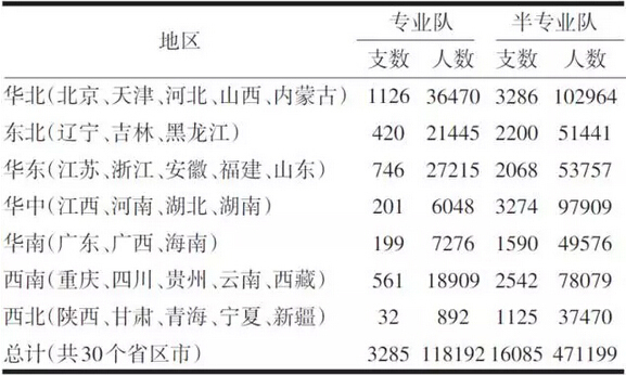 2011年底,中国大陆共有乡镇专职消防队3546个、志愿消防队10637个,村级专职消防队678个、志愿消防队114764个,覆盖率分别为42.6%和17.0%。