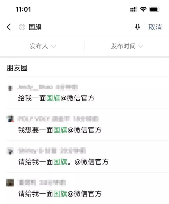 今天一大早,霜淇淋打开微信朋友圈,就看到满屏的“给我一面国旗@微信官方”,不仅内容相似,格式也一致。同事告诉霜淇淋,自己也是看到别人发布类似信息后跟风模仿,因为据说,发布这样的信息后,微信头像会出现一面红旗,比较契合国庆气氛。
