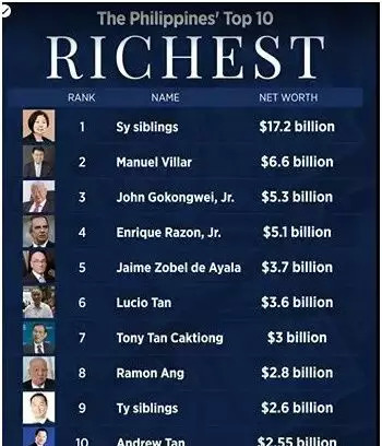 今年的富豪榜上,除菲律宾十豪外,前50豪还有许多上榜华裔富豪身影,比如排名第13的伊斯德诺·康孙希兄弟姐妹,净资产20亿美元。