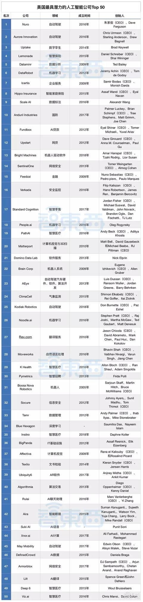 该榜单主要依据公司的机器学习技术、自然语言处理或计算机视觉等核心技术能力,而这些不仅是它们商业模式的核心部分,也是未来成功的关键。