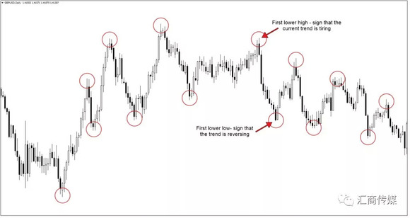 下图的GBP/USD日图就是很典型的趋势观察图,高点和低点之间的变化就能告诉你趋势是否改变了:
