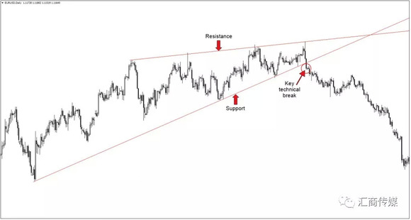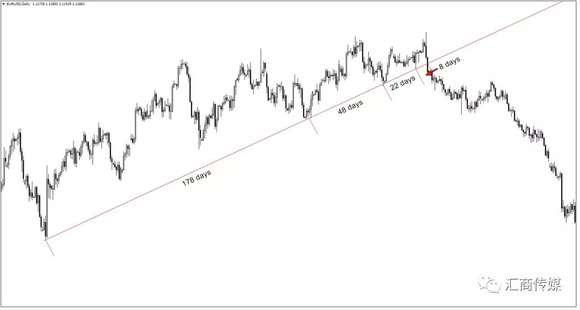下图是EUR/USD日图,这是一个真实的市场行情图,在前后256天的时间里,该货币对不断测试支撑位,且速度越来越快: