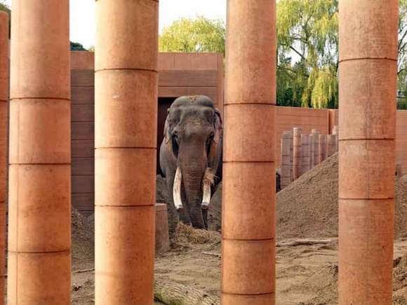 穆泽的新书对过去20年里建造的50座各国动物园建筑进行了调研,并且特别提到哥本哈根动物园里诺曼·福斯特(Norman Foster)设计的过分夸张的大象屋,她认为这是一个“动物需要与自己居住在其中的建筑争夺人们的关注”的地方。与此类似,由瑞士建筑设计师马库斯·施埃茨(Markus Schietsch)为苏黎世动物园设计的穹顶大象园区,则以其对大象更为友好的建筑方式而备受瞩目。这个别具特色的大象园区里面设有40多个“饲料仓库”,这些“仓库”都隐藏在约1.1万平方米的动物园区内,目的是鼓励大象主动觅食。此外园区内还建有各种水池,以供大象在里面打滚嬉戏,甚至还建有一个自动淋浴系统,方便大象自己洗澡,从而减少它们与动物园的饲养员的接触。