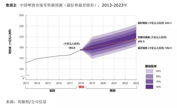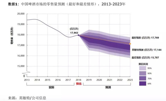 市场调查机构英敏特在一份2018年12月发布的报告中表示,未来5年,预计中国啤酒市场的零售量将有所下降,高端趋势可能保持零售额的增长态势。英敏特预测,啤酒零售市场的销售量将以-0.9%的年均复合增长率从2018年的179.63亿升跌至2023年的171.44亿升。