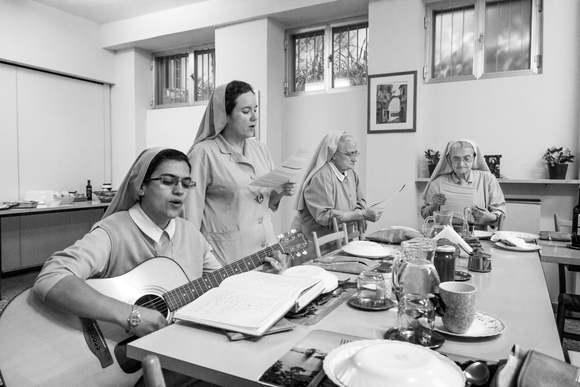 我试图了解修女们在祷告之外的活动,以及她们的日常生活。通常来说,修女们会醒来,祷告,然后开始各自的生活。修道院的每个人都有特定的角色:比如,一个修女负责花园,一个修女负责费用和行政事务,一个修女负责洗衣服。修女们每天都要花时间来完成自己的义务,同时也要兼顾日常的集体活动。每周一,修女们会去救济穷人食物,每周四她们会聚在一起讨论,等等。有时候,修女们还要参加国内外的宗教活动。