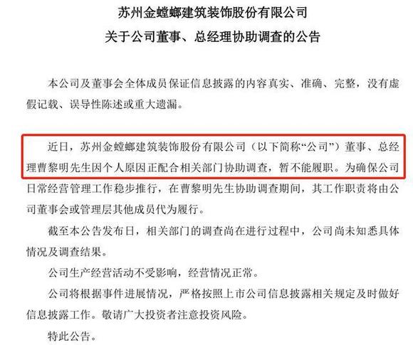 两天后,谜底揭开。金螳螂在回复深交所的问询函中表示,两天前收到相关部门的《留置通知书》和《立案通知书》,根据《中华人民共和国监察法》的有关规定,曹黎明因个人涉嫌行贿被实施留置调查。