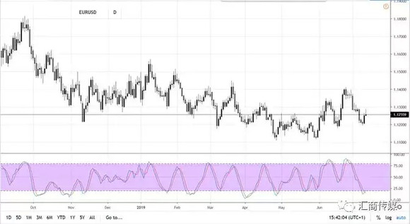 上图是一张欧元/美元日图。价格图表下面的小窗口显示了随机振荡器。高亮区域显示的是价格停留时间最长的区间。一些交易者称之为中立区或无用区。