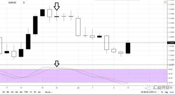 此时,我们不应该马上交易。而是等待蜡烛收盘。其次,等待随机信号的变化。最后,在与随机信号相对应的蜡烛收盘处入场交易(见下图)。