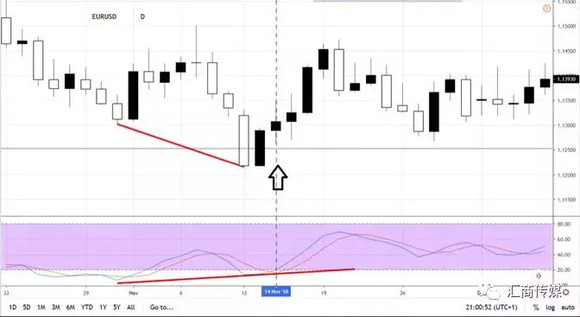 让我们看下面的一个例子。图中欧元/美元价格进入下跌趋势。就像任何下跌趋势一样,它会形成一系列较低的低点(Lower Low)。然而,随机振荡器并不能确认第二个低点。因此,在价格和随机振荡器之间出现了分歧。