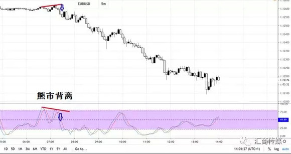 当价格和振荡器分别朝着不同方向移动时,就会出现背离。由于振荡器使用多个周期来绘制一个值,交易员对它更加信任。因此,在背离出现时,需要注意的事项包括: