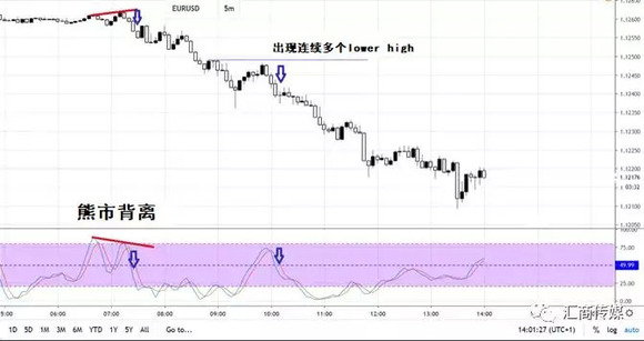 在熊市趋势中,多个Lower High(更低高点)/Lower Low(更低低点)的出现将起到决定性作用。继续以上图为例,当随机指标移动到50以上,这将是之前做空交易的出场点位。然而,尽管它确实突破了50,却未能突破多个更低高点。这说明看跌趋势依然存在(见下图)。