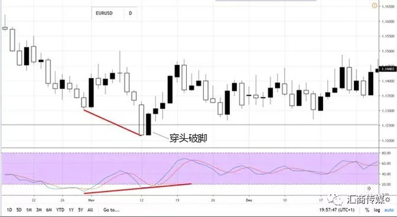 显然,日本的蜡烛图符合要求。换句话说,在使用随机指标进行交易时,寻找烛台的反转模式会有所帮助。我们可以寻找锤型、流星、吞噬、晨星等形态。回到之前使用的欧元/美元的例子,我们可以看到,在看涨的背离之后,一个“穿头破脚”紧随其后。