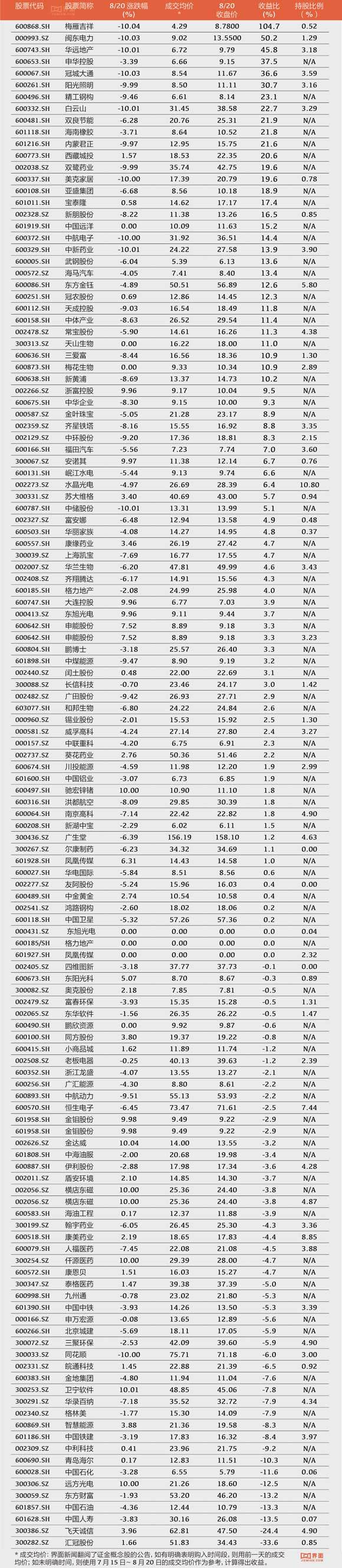 据不完全统计,证金在这一个半月的时间内扫了近百只个股。界面新闻根据公告的日期,统计了7月15日-8月20日这段时间内,“证金”概念股的成交均价,以此作为参考对比8月20日的收盘价,由此计算出的差价来反映证金扫货的收益情况。虽然证金一再强调其资金支持并非为了盈利,但是市场不理性的追捧往往让部分股价“一飞冲天”。