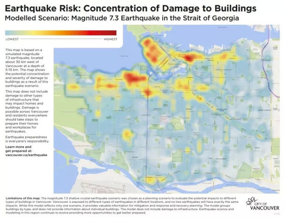 但也许有人曾想过,一旦发生大地震,温哥华到底哪些地方最危险、哪些地方相对安全这类问题,为推广这次演习,温哥华市府10月16日公布了市内建筑物地震风险的地图,供市民参考。