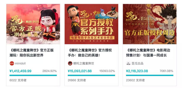 10月14日,电影的三个众筹项目也全部结束,筹集金额总计达到了1862.38万元。其中《哪吒》官方授权手办的众筹金额达到了1509.3万元,仅这一个项目的众筹金额,就刷新了电影在中国众筹记录。