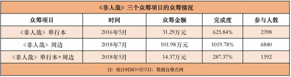 在统计的这176个项目中,基于漫画作品推出的绘本都有不错的表现。比如,2016年上线的《非人哉》第一部漫画单行本,完成率625.84%。这个项目,刷新了这个品类在当时的众筹金额。