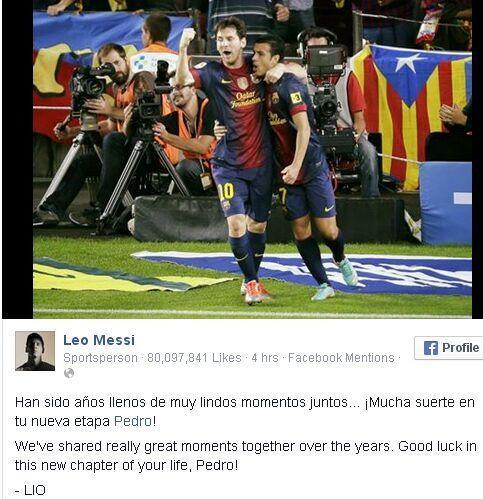 不争不抢,毫无怨言,这就是佩德罗。佩刀离开后,梅西第一时间在脸书上写道,“在这些年我们一起度过了许多美好的时刻,祝你在人生的新篇章中好运,佩德罗。”