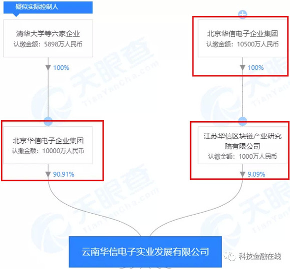 据天眼查显示,云南华信电子有两大股东,江苏华信区块链是其中之一,持股比例9.09%;而另一大股东则为北京华信电子企业集团(简称:北京华信),持股90.91%。与此同时,江苏华信区块链为北京华信100%控股子公司。