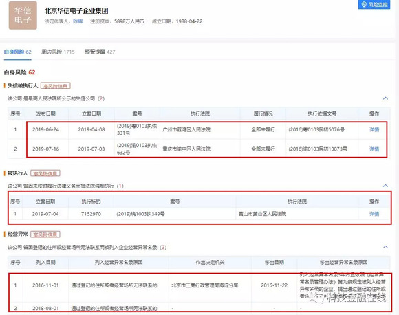 2019年6月24日,北京华信因有履行能力而拒不履行生效法律文书确定义务,被列为失信被执行人,执行法院为广州市荔湾区人民法院,执行标的为10万。