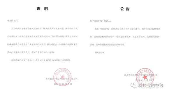 11月5日,银谷在线在其官微发布了两则公告,一则是银谷在线称已联合新股东云南华信电子实业发展有限公司(简称:云南华信电子)推出资产保全计划的声明;