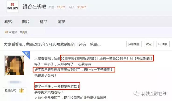 事实上,在银谷在线发布推出资产保全计划公告之前,已有出借人反映平台兑付出现了问题。有出借人在银谷在线吧发帖表示,所投标的分别在2018年9月30日、11月18日到期,截至现在已经一年多时间,平台仍未还款。