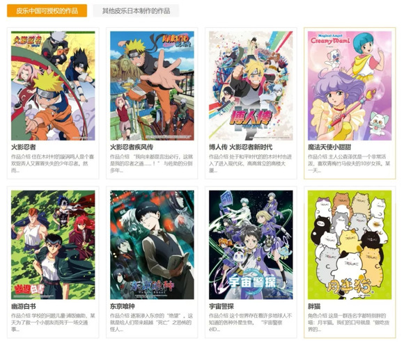 目前,皮乐中国可授权的IP有火影忍者、魔法天使小甜甜、幽游白书、东京喰种、博人传、黑色四叶草、胖猫、宇宙警探等。不过同时我们也可以发现,也有其他Pierrot制作的作品不在这之内,如:阿松、福星小子、十二国记等。