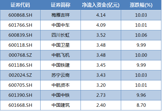 个股方面,梅雁吉祥(600868.SH)、中国中车(601766.SH)、四川长虹(600839.SH)三只个股领衔今日十大资金净流入个股。其中,“证金概念股”梅雁吉祥今日遭主力8.08亿元资金抢筹,截至收盘资金净流入4.14亿元,居于首位,并以涨停报收。中国中车、四川长虹分别以4.09亿元、3.52亿元的净流入资金额排在二、三位。