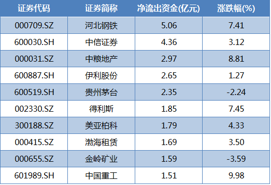 在688只资金净流出个股中,河北钢铁(000709.SZ)资金净流出最多,净流出额为5.06亿元,涨幅7.41%。而近几日陷入漩涡的中信证券(600030.SH)资金净流出4.36亿元,排在第二位。中粮地产(000031.SZ)以2.97亿元的净流出资金额排在第三位。