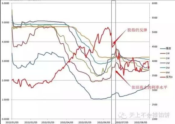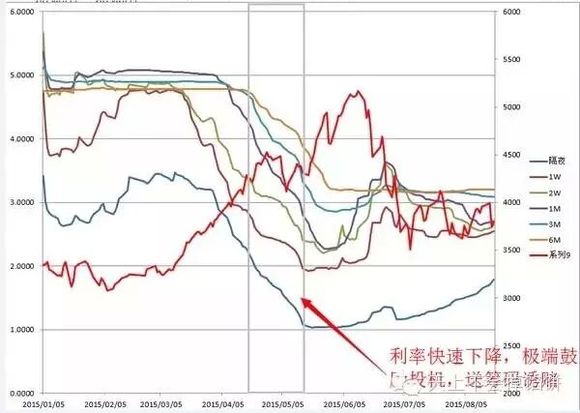 上图里的红线,是上证指数,其余各色的线,是Shibro各个时间周期的利率。我们可以看到利率下降得非常坚决。特别是出现大跌的时候,本已经下降得厉害的利率进一步下降,坚决程度罕见。