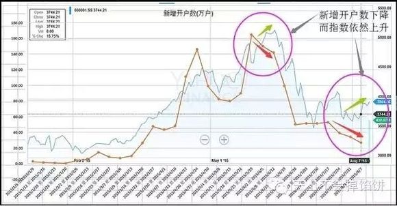 蓝颜色的是股市的指数,橙色的是新增开户数。