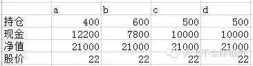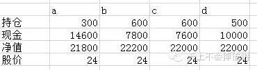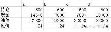 a 的净值最低,其余的入场越早的人净值越高,入场越晚的越低。不过这都不算什么,因为所有人的净值都增加了,人人都是股神。