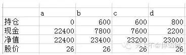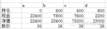 a 再将手上的300股一下以26的价格抛售,d 是个右侧交易者。听闻大神们在朋友圈质问他“有些人在泡沫里越来越富有,有些人在泡沫里越来越聪明,你要做哪个?”等至理名言,果断成为成熟的右侧交易者,从a这里以26买下了300股。