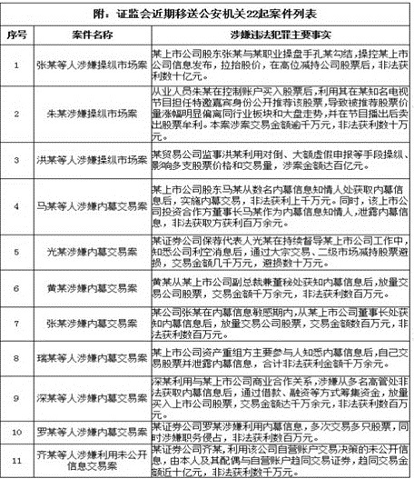 证监会新闻发言人张晓军在上述发布会上表示,证监会近日向公安部集中移送22起涉嫌操纵市场、内部交易及编造传播虚假信息等犯罪案件。