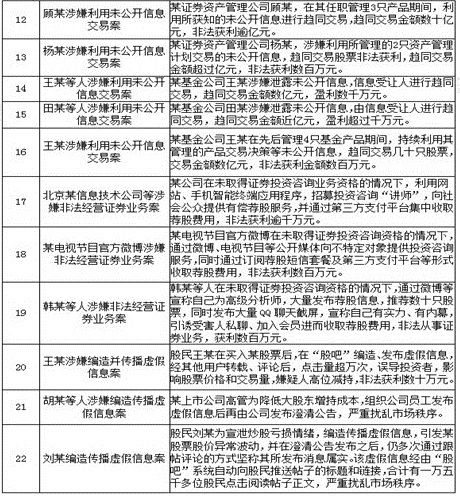 根据界面新闻记者查阅证监会公布的这22起违法案件的详情列表,涉案主体主要为证券公司、基金公司、上市公司的高管,及个别股民。涉案金额最高至百亿元,最低为数10万元。