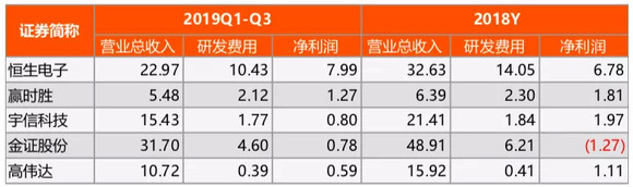 表1:5家公司2019Q1-Q3、2018Y财务情况(单位:亿元)