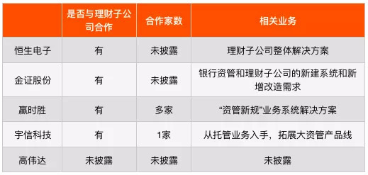 目前,恒生电子的业务集中于理财销售端的改造升级重构。2019年上半年,恒生电子中标BTA(注:BTA为运营保障系统)项目已有20多家。由于理财子公司横跨银行和资管两个模块,金证股份除了支撑银行资管部门净值化转型,还进行资管产品方案的整合。其全资子公司联龙博通为了加快银行业务布局,除了增加员工薪酬以外,还将IT开发转为外包。赢时胜推出银行理财“资管新规”解决方案,推进理财业务转型,目前已中标多家银行理财子公司进行业务系统建设。宇信科技与一家股份制银行在大资管领域展开合作,目前正在拓展包括理财、托管、智能投顾、风险控制管理等产品线。