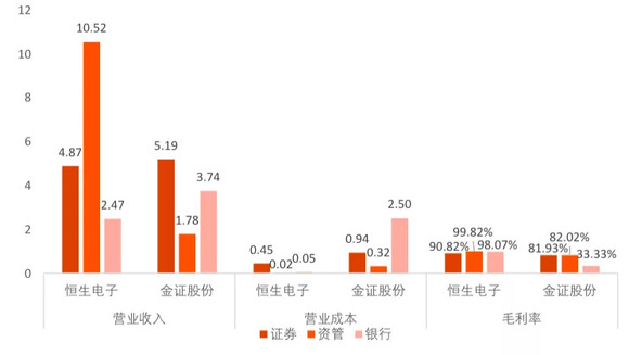 图1 :截至2018年末,恒生电子和金证股份证券、资管、银行业务(单位:亿元)