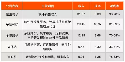 表2:5家公司软件及服务2018年财务数据(单位:亿元)