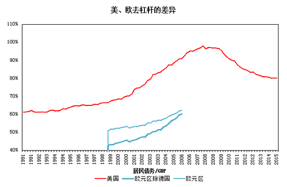相对欧洲,美国经济更快复苏,原因正是更快的去杠杆化。美国的居民负债/GDP比率已从2008年100%的峰值,回调到2014年的80%;欧洲的负债率则长期在高位徘徊。那么美国去杠杆较为顺利的原因是什么?因为美联储率先推出“量化松宽”的政策吗?非也,起码也是不尽然。