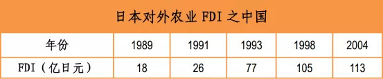 作为日本近邻的中国,自然也是日本发展海外囤田的首选。从1989年到2004年,日本对外农业FDI中仅对中国的投资就从18亿日元增长到113亿日元,涉及的投资项目多达233个。到2015年,中国成为日本农林、渔业关联企业投资最多的国家,涉及的日本企业多达242家 。