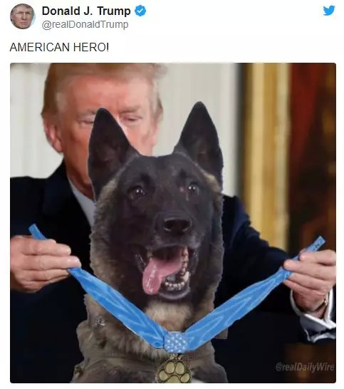 不久前,川普在推特上接连夸赞了一条军犬,说它在逮捕和杀死ISIS头目时做出了“了不起的工作”,甚至是“美国英雄”。