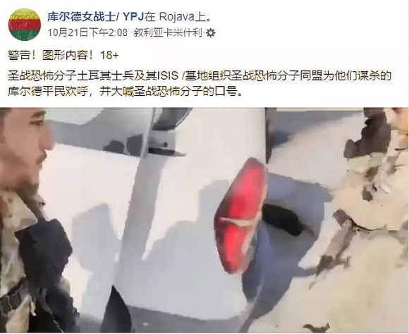 视频里,一名YPJ女兵被身为土耳其盟友的激进分子围住,她的尸体已被损毁。几个激进分子对着镜头示威,称“这就是你送到我们这里来的一个妓女。”