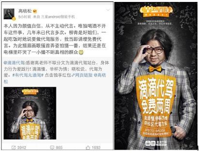 娱乐至死的年代,围观的八卦群众岂能放过?网友们用自制海报的形式,玩了一把互动——在各种网络自制的滴滴代驾海报中,高晓松被P成各种姿势,不过相信素来热爱网络互动的高晓松也不会介意。用一句俗话说,“玩才是社交媒体的真谛啊”。