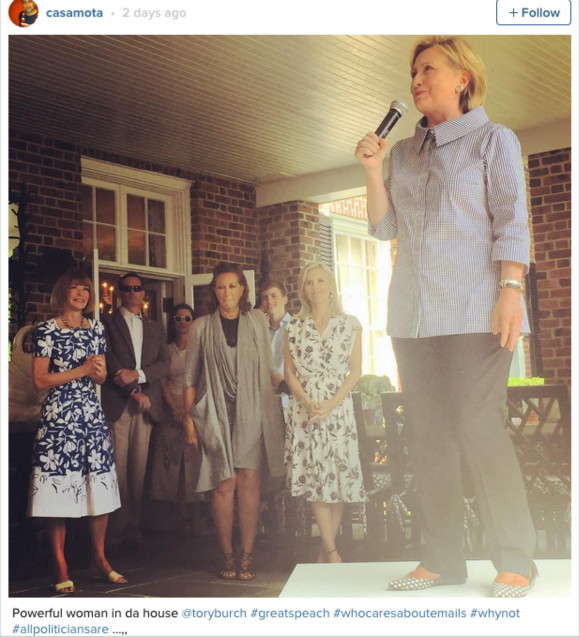 据近日《每日邮报》的消息称,希拉里上周末很忙,她先是参加了两个在汉普顿举行的筹款活动,随后又赶往美国时装设计师Tory Burch在南汉普顿的住宅,加入了一场由Vogue杂志美国版主编Anna Wintour、设计师Donna Karan和Tory Burch三人组织的花园午宴。其他的座上客还有Jill Stuart、Shelby Bryan,Stacey Bendet等设计师和名流,总共200人。