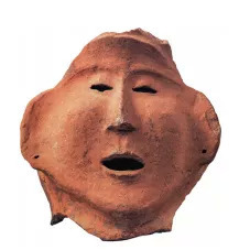 红陶人面像,残高 15.3 厘米,宽 14.6 厘米, 甘肃天水市柴家坪出土,仰韶文化石岭下类型(距今五千二百年)。