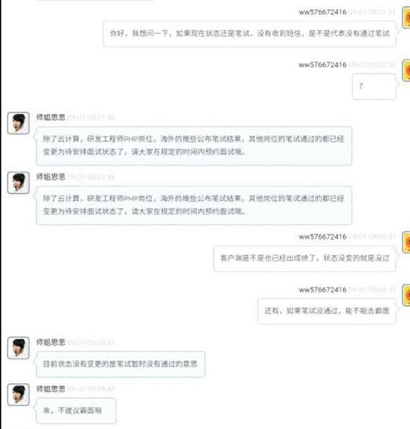洪羽的大部分消息都是通过微信群、qq群得到的:“收到阿里的电话通知,今年业务型产品经理校招名额已满,后续流程取消。”“很多在阿里实习的同学都被直接退了,咱们这些走内推和普通校招通道的更没戏了。”洪羽加的58人阿里市场职位群、470多人的内推微信群和两个500人阿里校招qq群里的人几乎都被拒掉了,很少看到有人通过笔试。洪羽说:“刚开始还偶尔有应聘技术岗位的同学进入面试环节,但是到了产品、市场、运营回绝的力度很大。”目前应聘国际市场培训生职位的洪羽在阿里校招系统的个人档案中显示“已回绝”,停留在“简历评估”环节——这是她参加这次阿里校招的终点。