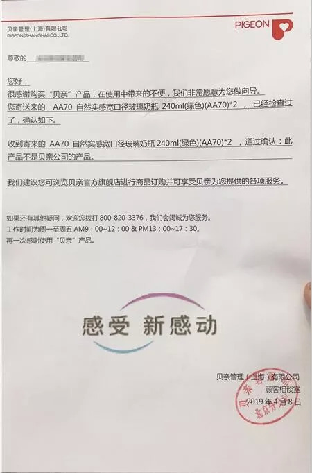 据悉,某门店在海拍客平台上购买了贝亲的一款奶瓶,收到货后发现和自己通过正规渠道购进的同款奶瓶防伪码有着明显不同,于是该网友就把两款奶瓶拿到官方求证产品真假,经过官方确认:从海拍客购买的奶瓶非贝亲公司产品!