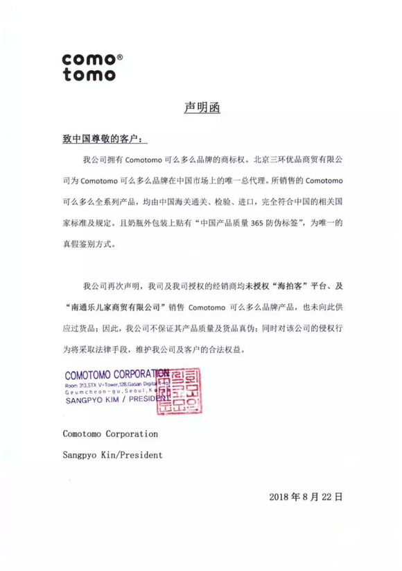 而在2018年8月,母婴门店反馈在海拍客购买的可么多么奶瓶为假货,和海拍客多次交涉无果,最后还是Comotomo可么多么官方发布声明函称:我司及我司授权的经销商均未授权“海拍客”平台、及“南通乐儿家商贸公司”销售Comotomo可么多么品牌产品。因此,我司不保证其产品质量及货品真伪;同时对该公司的侵权行为将采取法律手段,维护我司客户利益。