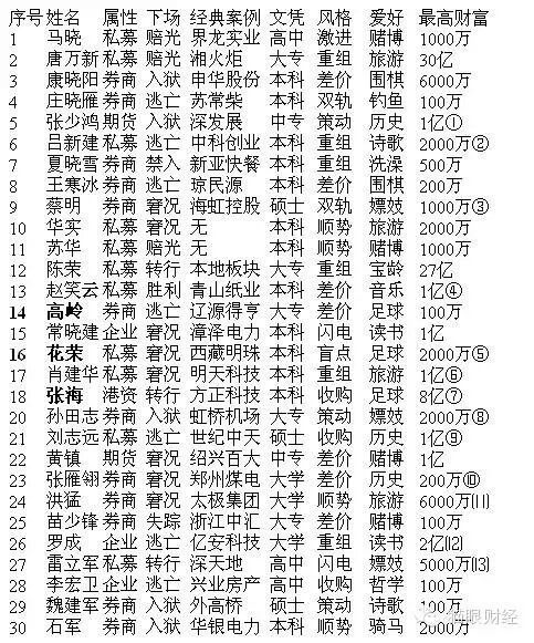 公司系的代表有汉龙集团的刘汉、刘坤,宏达集团的刘沧龙,三读集团的张少鸿,上海邦联集团的徐涵江,北大明天系的肖建华等;私募系的有最早期典型操纵界龙实业的马晓,登峰造极的德隆系的唐万新、高江,恶炒青山纸业的股评家赵笑云,坐庄西藏明珠的花荣等;券商系有操盘琼民源的广发证券王寒冰,操盘辽源得亨的辽国发高岭,操盘粤电力的西北证券原总裁马世兵等。诸如在后人看来也是炒股暴富的天发企业的龚家龙、中路集团的陈荣等人,在这份名单上显得平淡无奇。
