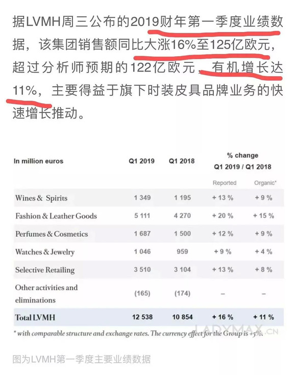 根据LVMH的2019财年第一季度业绩数据,集团销售额上涨16%至125亿欧元:
